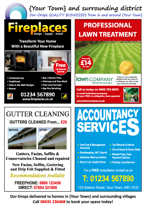 Only one business type per publication may advertise. The Dor-Dropz is distributed in the local community by your Local DOR-2-DOR franchisee. Standard adverts are 95mm x 120mm so plenty space for a good looking advert or take 2 spaces for even more impact.